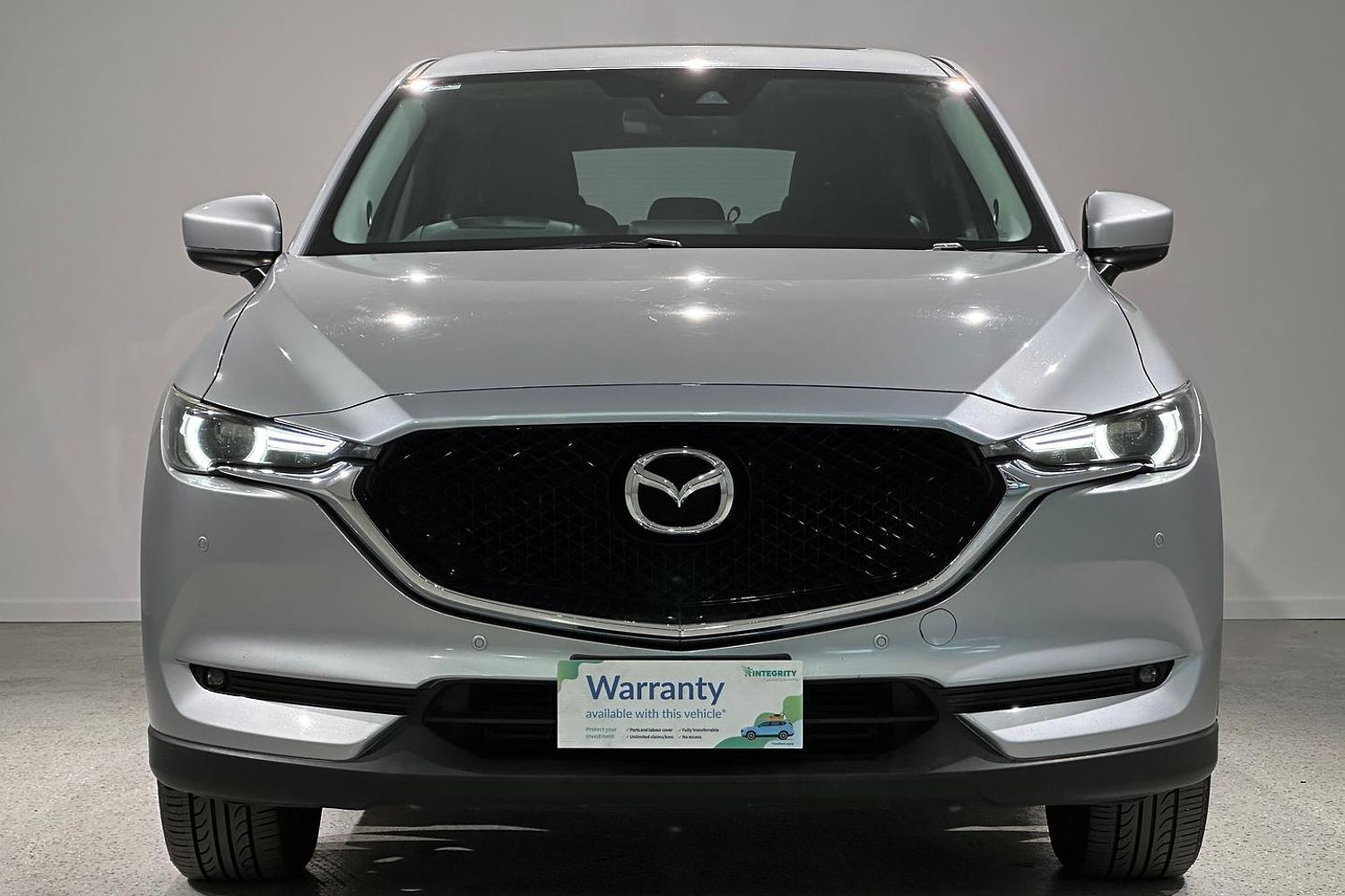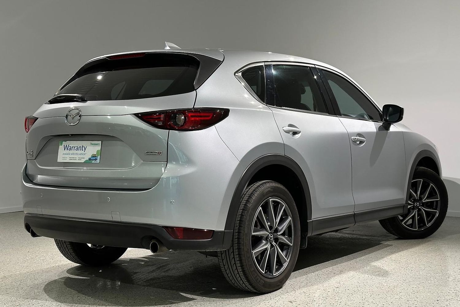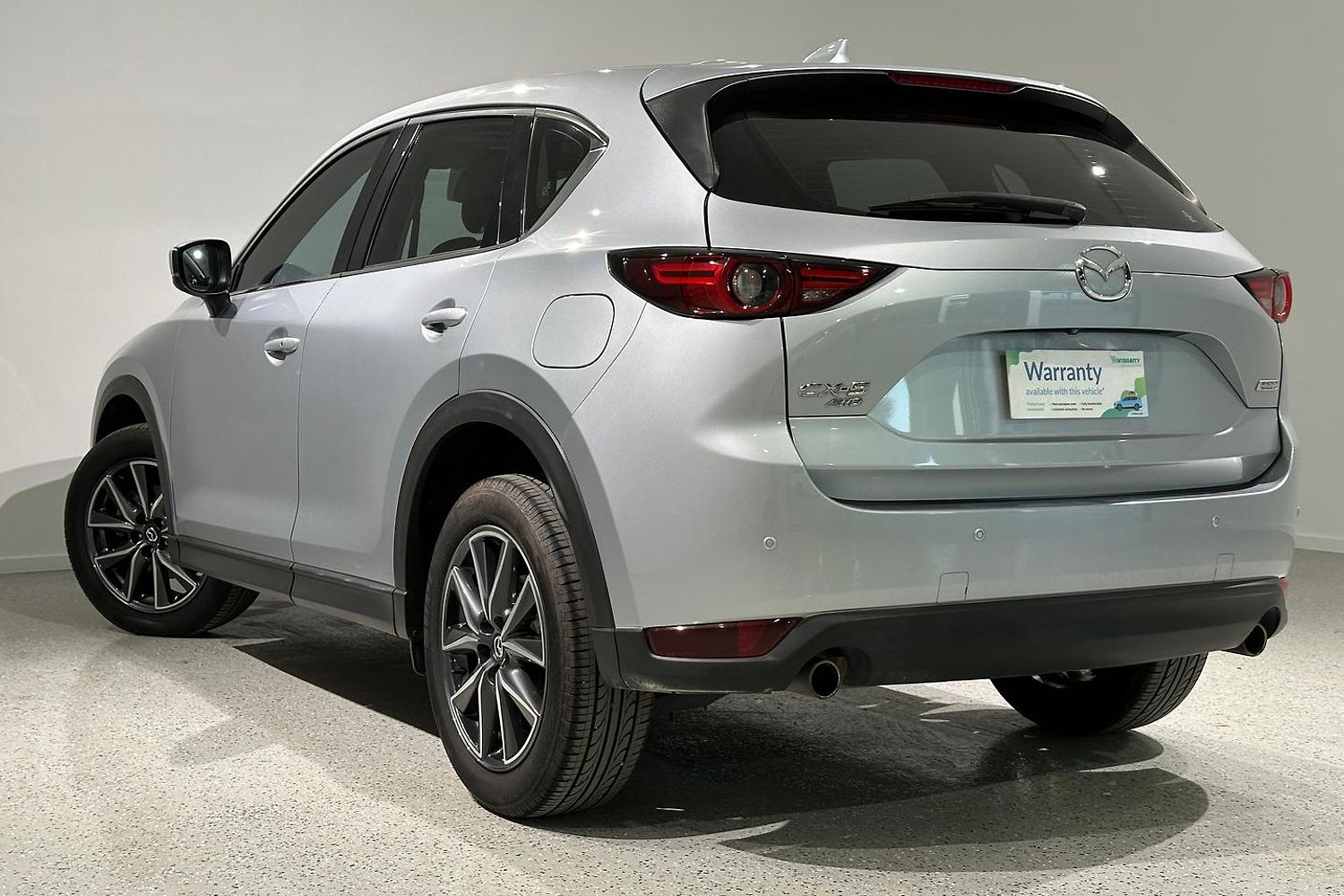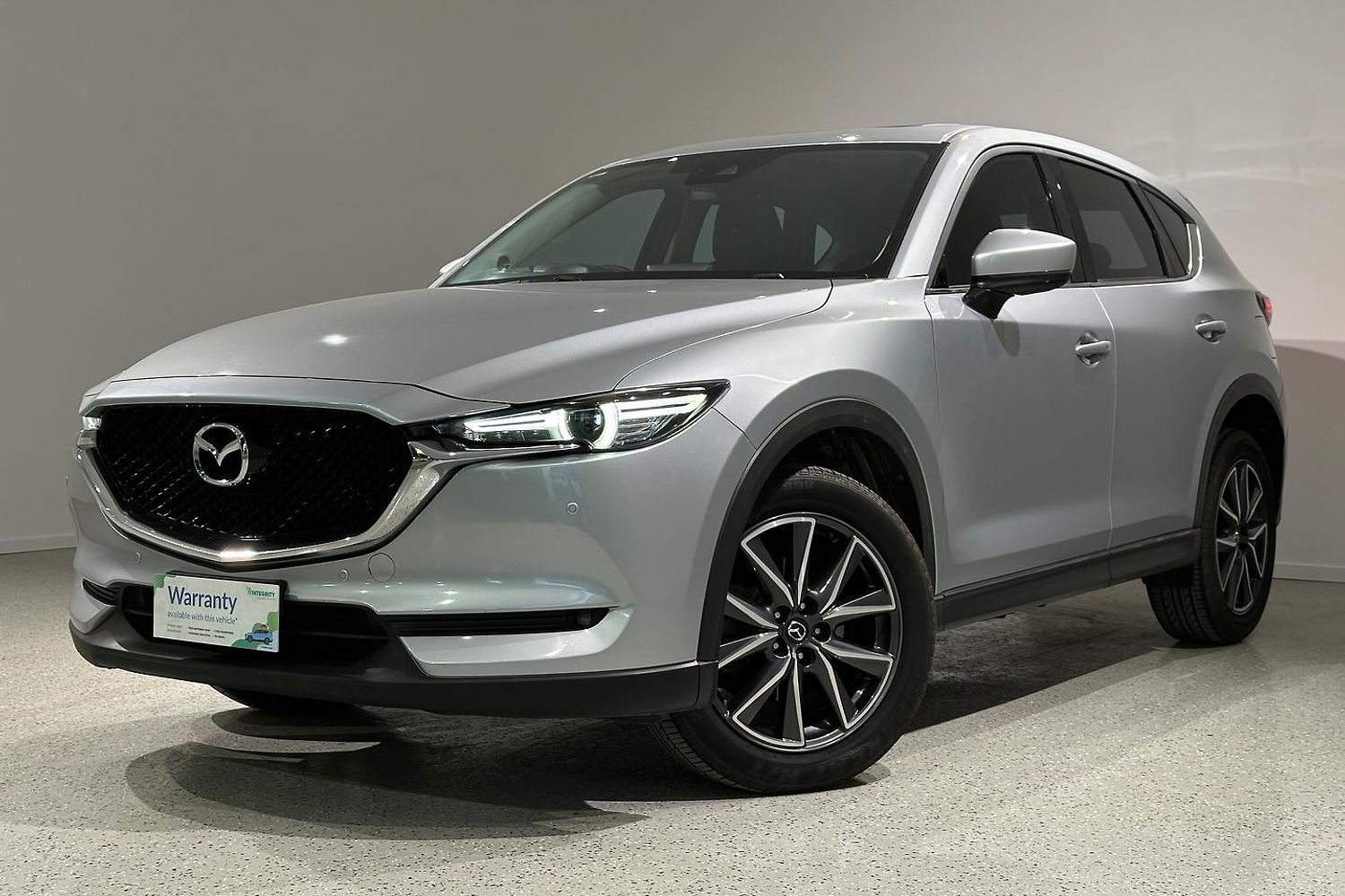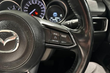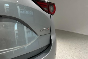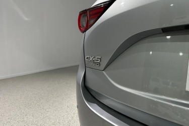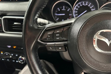 The exterior design of the CX-5 GT is both elegant and sporty, characterized by Mazda's KODO design language. It boasts a bold front grille, sleek LED headlights with auto on/off functionality, and 19-inch alloy wheels that give it a commanding road presence. The integrated roof rails and a rear spoiler add to its practical and stylish appeal, while the power tailgate provides convenience for loading and unloading cargo.