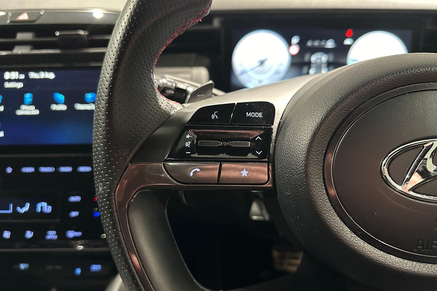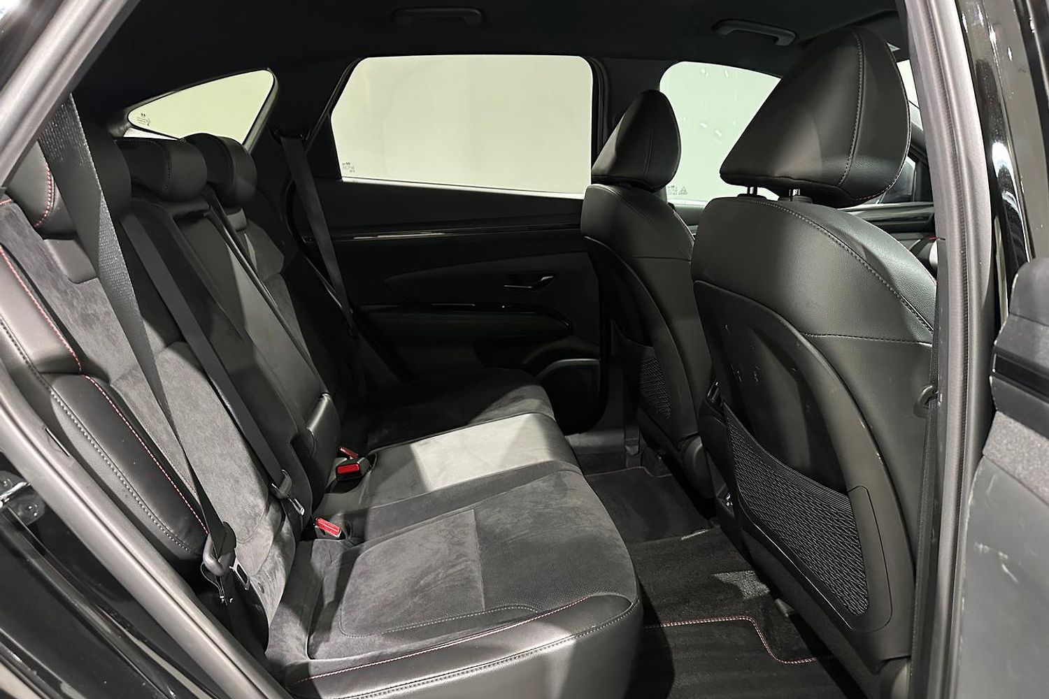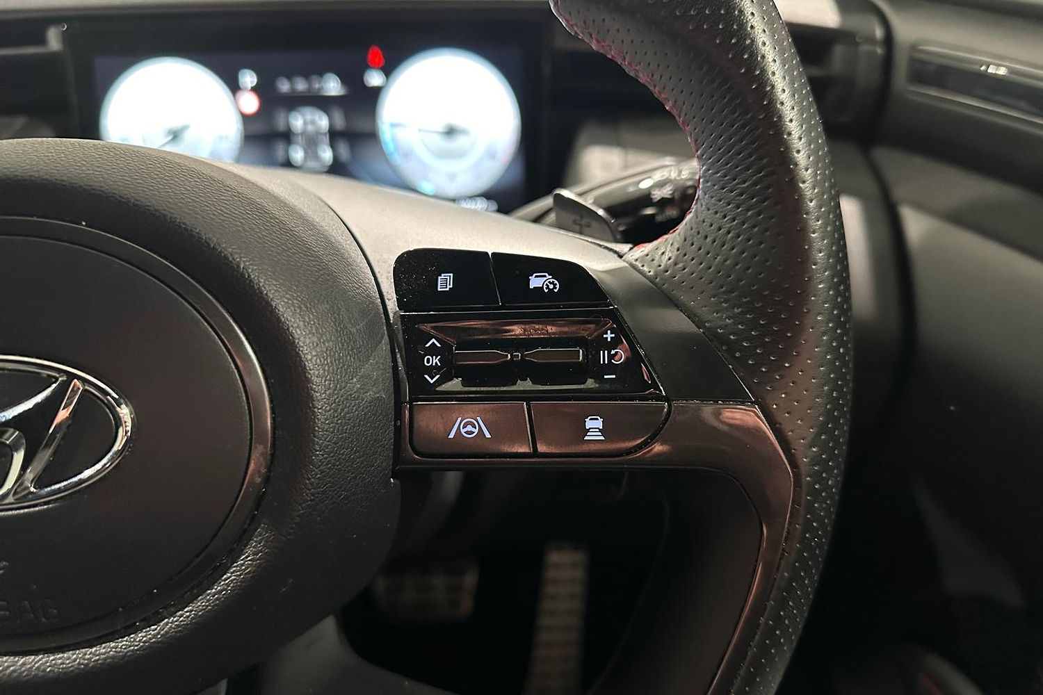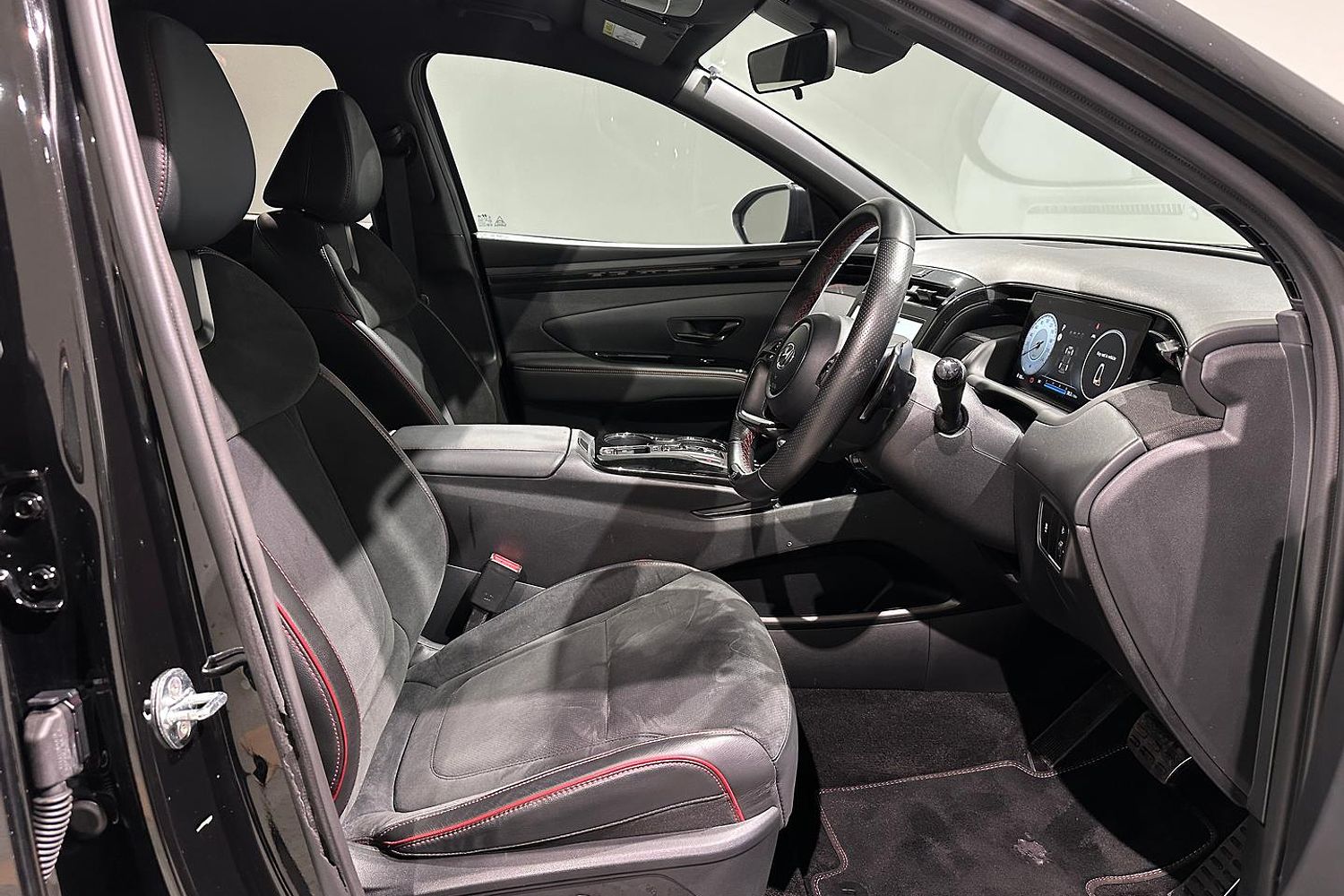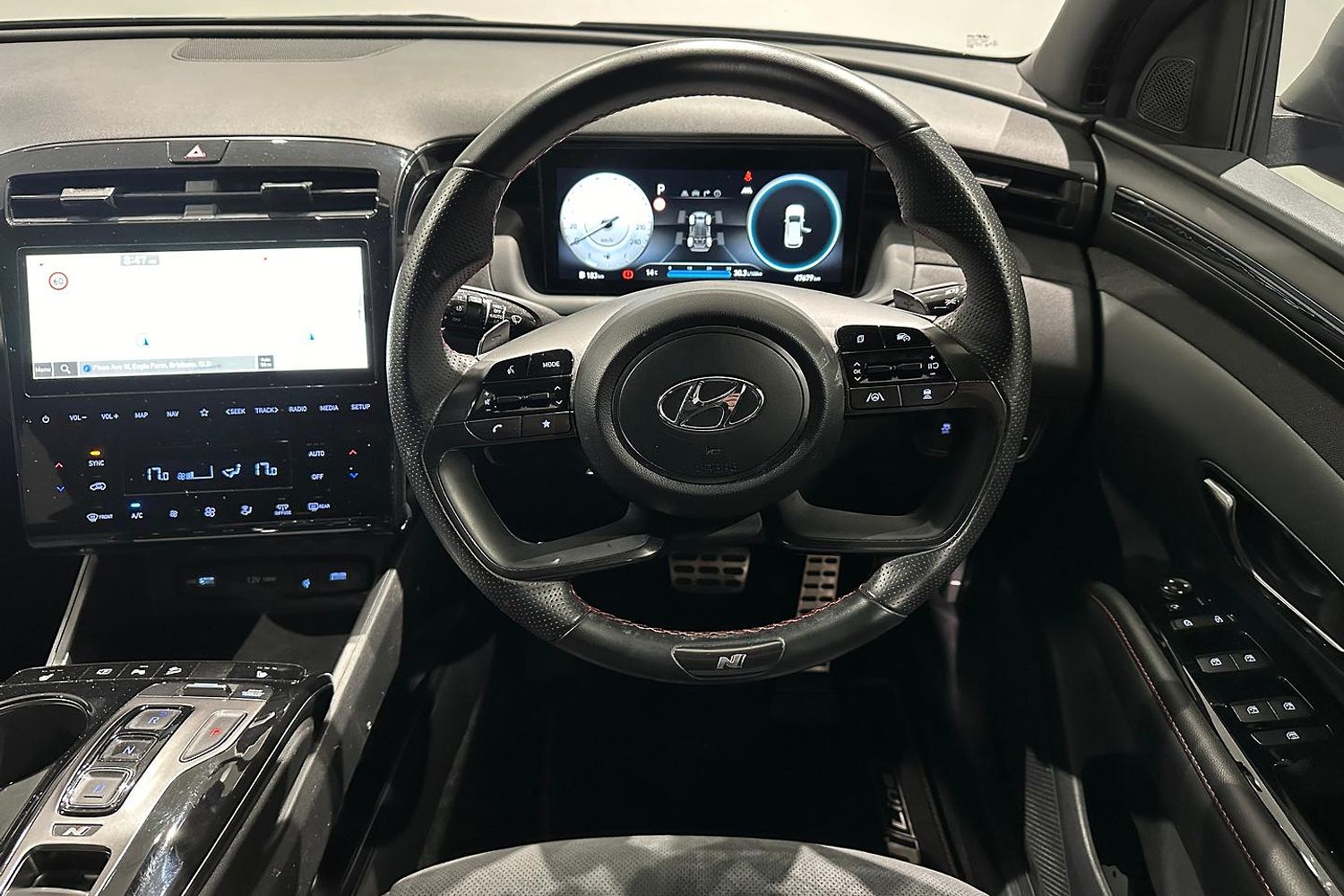 Inside, the Tucson Elite N Line offers a spacious and well-appointed cabin with seating for five. The N Line trim adds sport-inspired features, including N-branded leather and suede seats, a leather-wrapped steering wheel with red stitching, and metal pedals. The interior design is both functional and stylish, with high-quality materials and a driver-focused layout.