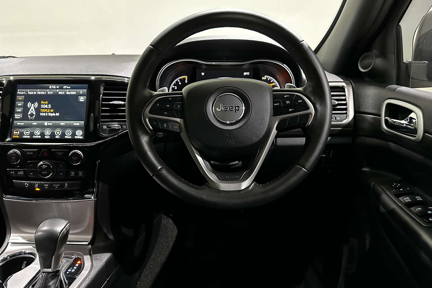 – Leather-wrapped steering wheel with paddle shifters