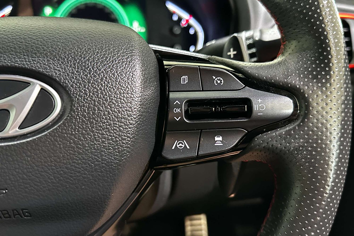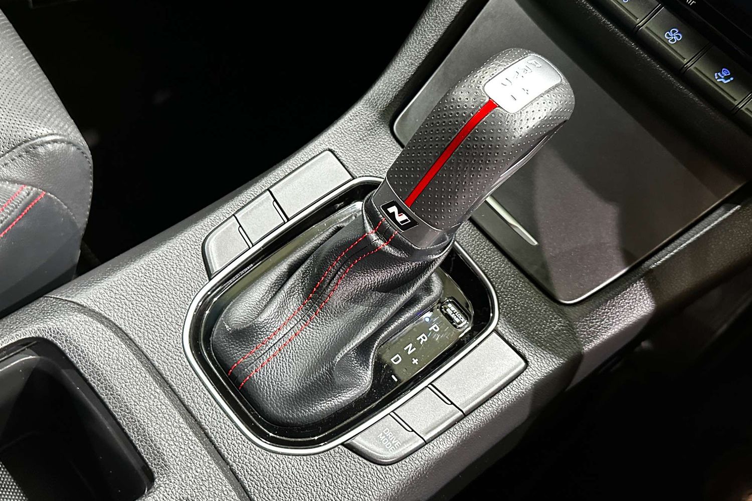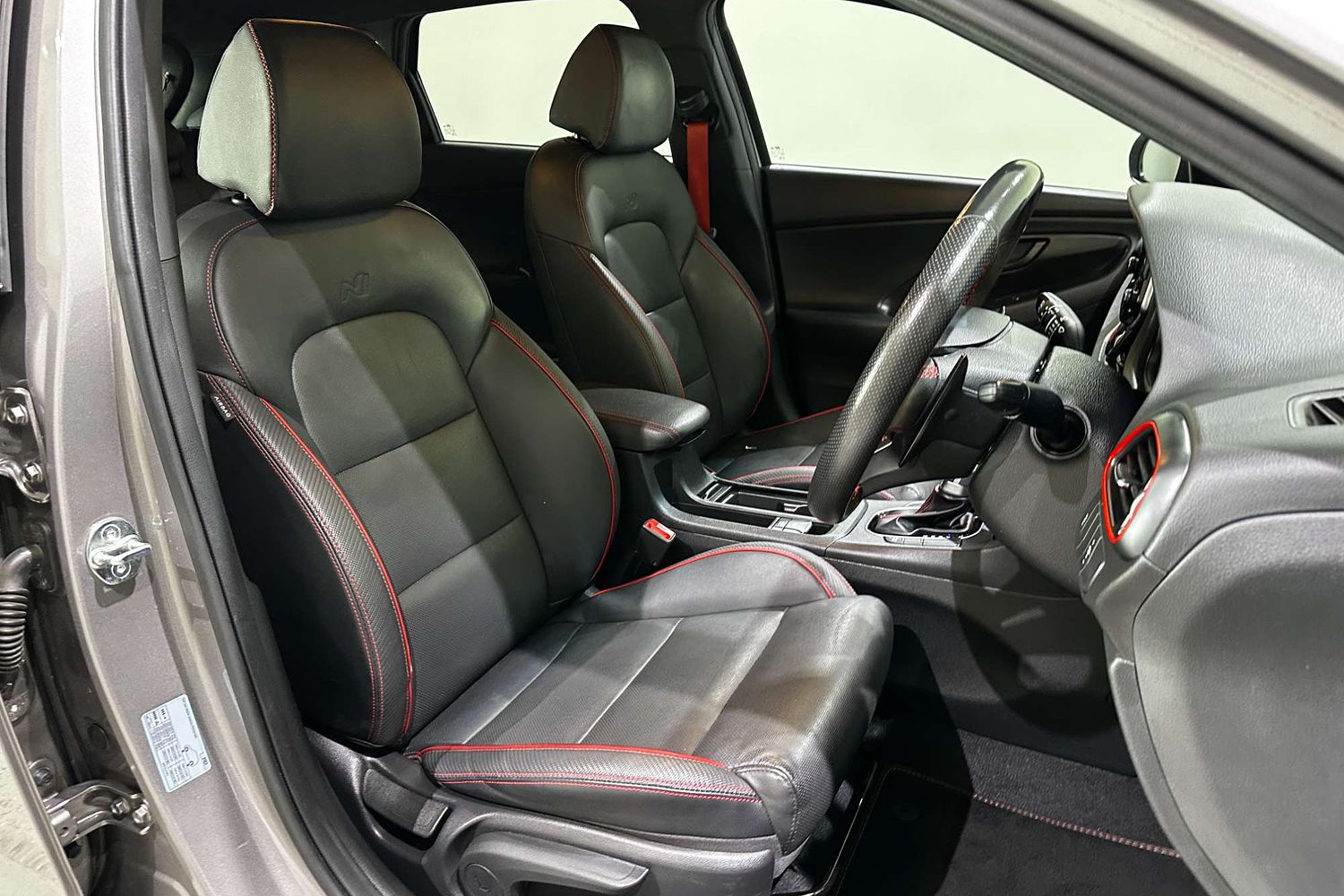 – Leather-wrapped steering wheel with red stitching