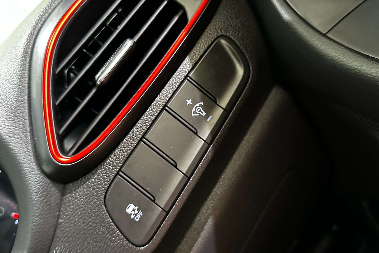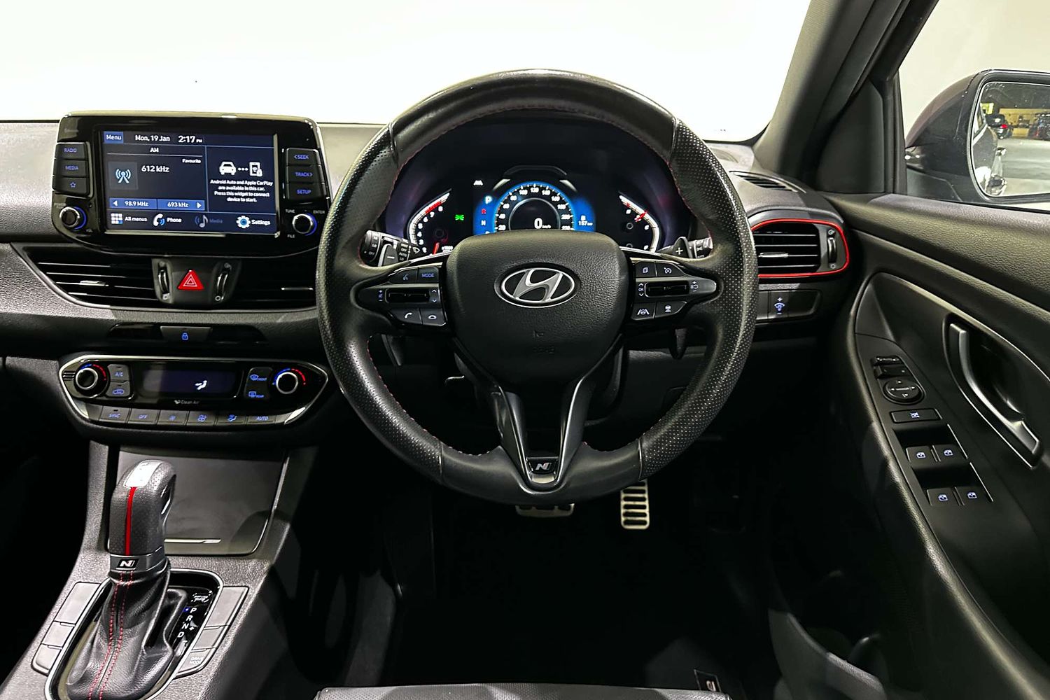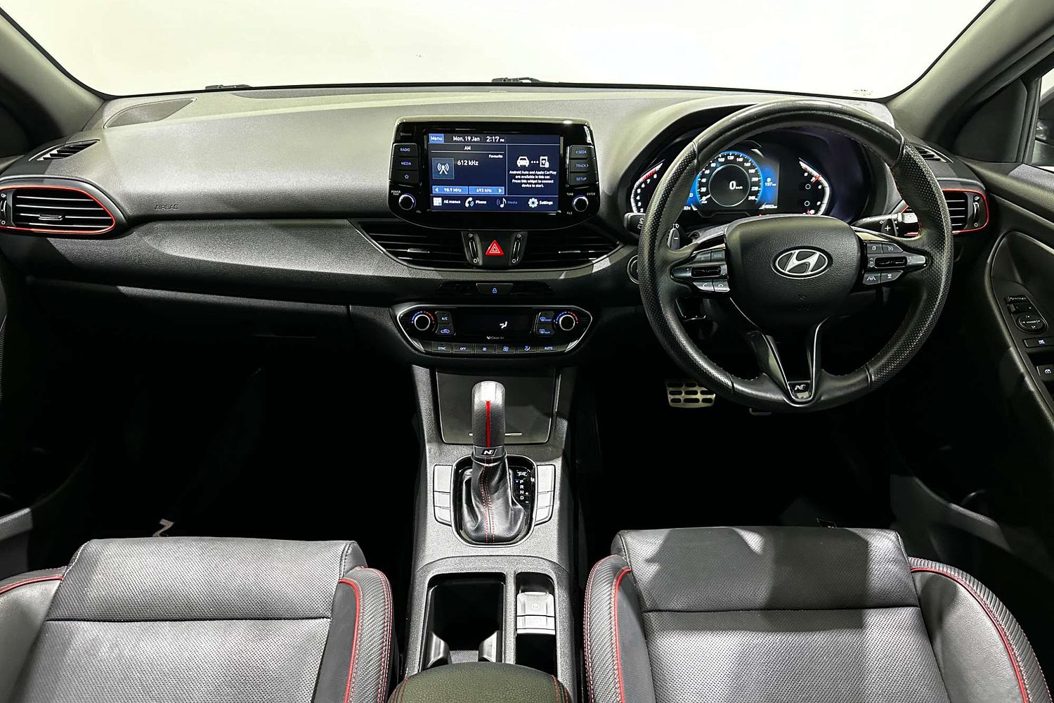 – Leather-wrapped steering wheel with red stitching
